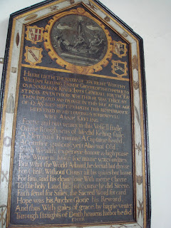 "Heere lieth the boddy of the right worthy William Keeling Esquire Groome of the Chamber to our Soveraigne Kinge James Generall for the [Hon] East Indiae Adventurors whether he was th[r]ice by them imployd and dyinge in this isle at the age of 42 anno 1619 Sept 19 hath this remembrance heer fixed by his loveing & sorrowfull wife Anne Keeling.