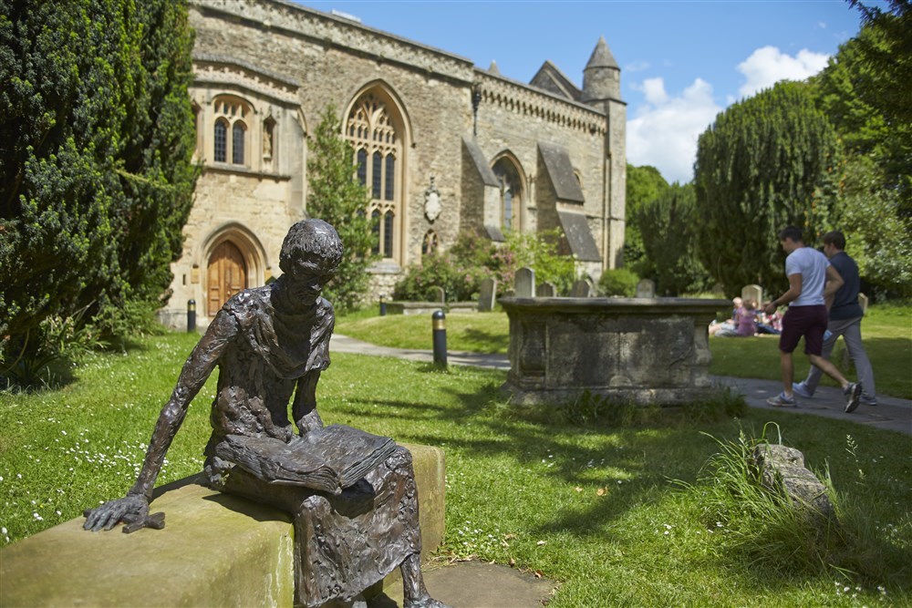 Edmund's name is preserved in Oxford in the college St Edmund Hall, in the east of the city, which stands on the site of a house where Edmund is said to have taught. There's a modern sculpture of Edmund in the grounds of the college (above), which shows him reading - a companion to today's students, who can sit and read next to him if they like. He is depicted in thirteenth-century stained glass, made within a few decades of his death, in the church of St Michael at the Northgate: